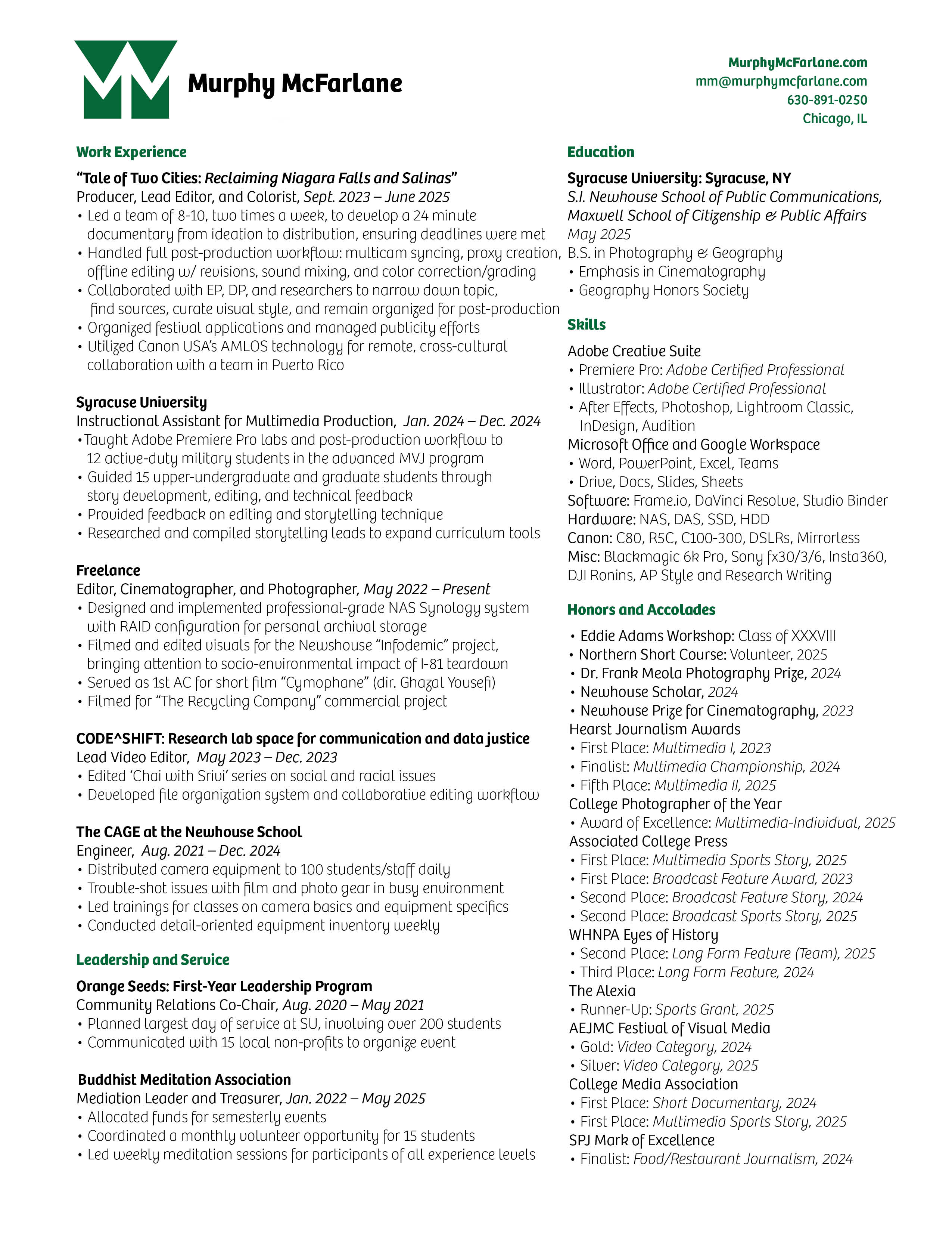 I specialize in post-production editing and have expertise in photography and cinematography. Undaunted by the unknown, I was the first student to complete the new cinematography curriculum at the S.I. Newhouse School of Public Communications. My work has been recognized by organizations like Hearst, CPOY, WHNPA, the Alexia, and DCEFF; I am an alumna of Eddie Adams Workshop, XXXVIII.
